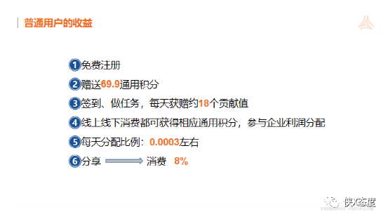 普通用户:商城自购商品获取通用积分,通用积分按照每日万分之三释放为贡献值,可享受直推用户消费额8%的奖励;