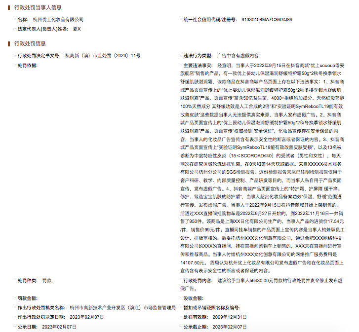 被处罚的公司名叫杭州优上化妆品有限公司,这家公司成立于2021年11月,公司法人代表名叫夏桐,该公司在2022年11月曾宣布获得了千万级融资,但并未透露具体的投资方。