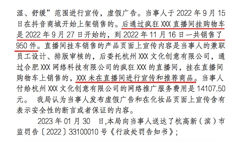 行政处罚决定书中还提到优上公司于2022年9月15日在短视频平台商城开始上架销售的。后通过“疯狂XXX直播间”挂购物车是在2022年9月27日开始的,到2022年11月16日一共销售了950件。这里的“疯狂XXX直播间”应该指的就是疯狂小杨哥直播间。