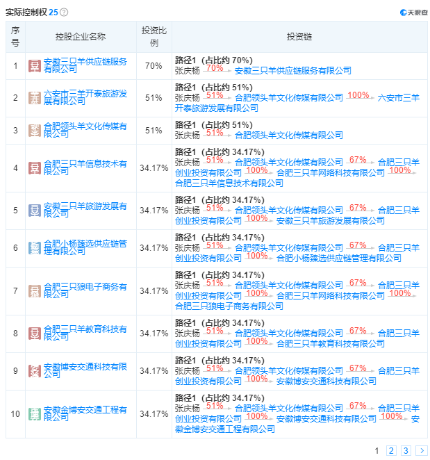 天眼查显示,“小杨哥”张庆杨通过直接或者间接持股的方式拥有25家公司实际控制权,其中包括安徽三只羊供应链服务有限公司、合肥三只羊信息技术有限公司、合肥小杨臻选供应链管理有限公司、合肥三只羊信息技术有限公司等。