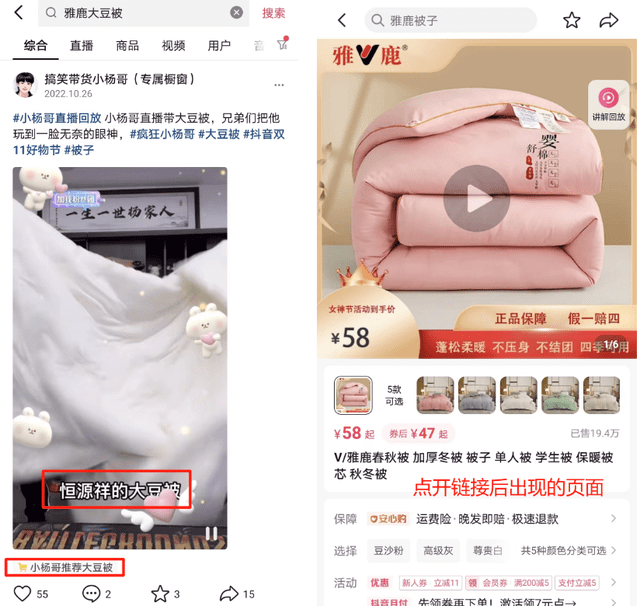 一个案例是,王海质疑小杨哥切片视频带货的雅鹿大豆纤维被不含大豆纤维。实际上,小杨哥切片视频里推荐的是恒源祥大豆纤维被。消费者购买雅鹿大豆纤维被的店铺告诉红星资本局,自己从未与小杨哥团队合作过。