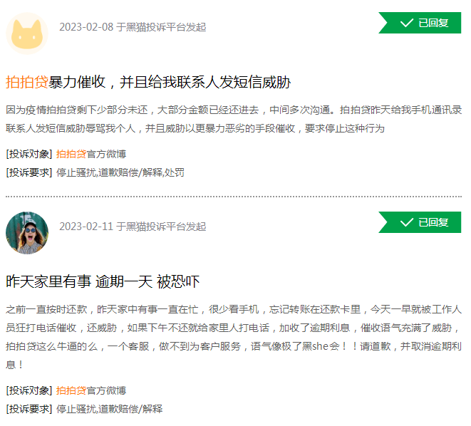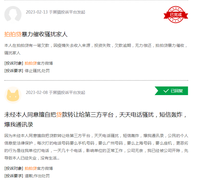 在网上搜索拍拍贷催收,这样的投诉就有不少。仅在黑猫投诉平台就有三万多条拍拍贷相关内容的投诉。“暴力催收”、“电话短信骚扰”、“上门恐吓”等等这样的字眼比比皆是。