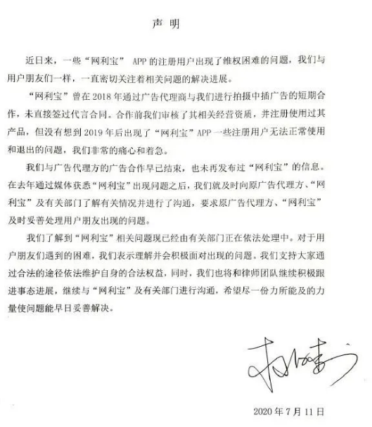 公告认为:“知名公众艺人在接到部分网贷平台的代言邀请后,对于平台利用其影响力吸引投资人购买非法金融产品,没有合理审查、作出不实宣传带来的负面影响,负有不可推卸的责任。”