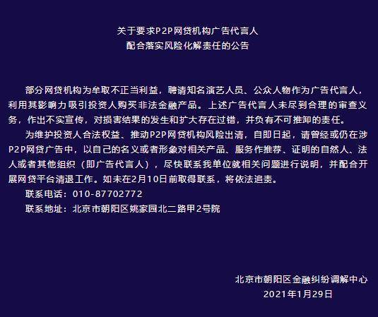 值得注意的是,今年1月29日,一则北京朝阳区金融纠纷调解中心发布了的公告引发诸多关注,其中明确要求P2P网贷机构广告代言人要配合落实风险化解责任。