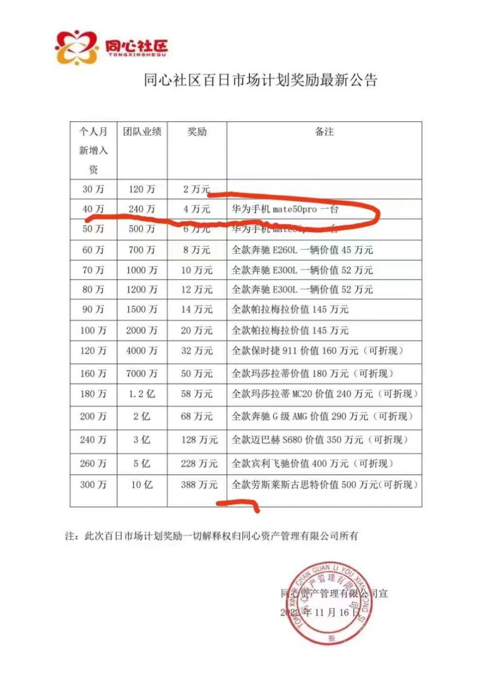 到了去年10月份,“汇能共享”的投资活动更是加大,推出了一个名为“百日计划”的活动,让多名受访者无不心动。多名受访者告诉上游新闻记者,投资金额不同,奖励和奖品也不同。除了固定收益,以个人投资30万元为例,一次奖励2万元,同时还能获得一部智能手机;个人投资60万元、团队业绩120万元,能获得奖励10万元,还能领到一辆价值52万元的奔驰轿车。