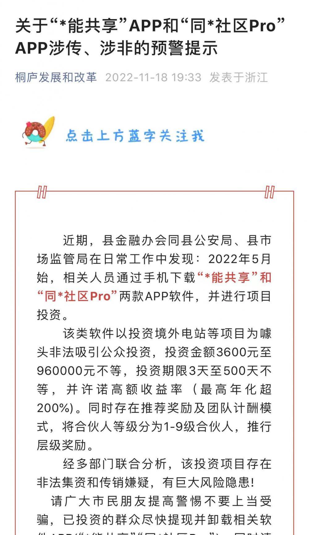 近期,县金融办会同县公安局、县市场监管局在日常工作中发现:2022年5月始,相关人员通过手机下载“*能共享”和“同*社区Pro”两款APP软件,并进行项目投资。经多部门联合分析,该投资项目存在非法集资和传销嫌疑,有巨大风险隐患。请广大市民朋友提高警惕不要上当受骗,已投资的群众尽快提现并卸载相关软件APP。同时请广大市民互相宣传提醒,防止更多的人员上当受骗。