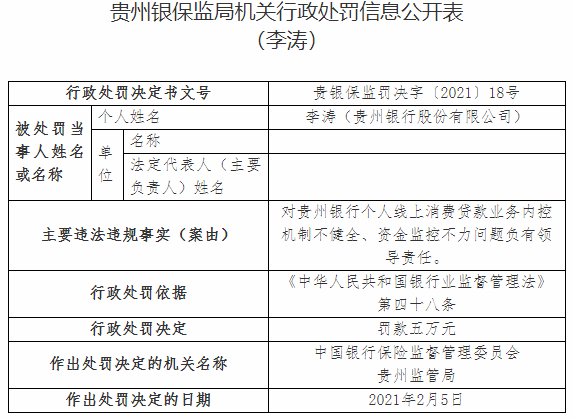 李涛对贵州银行个人线上消费贷款业务内控机制不健全、资金监控不力问题负有领导责任。根据《中华人民共和国银行业监督管理法》第四十八条,中国银行保险监督管理委员会贵州监管局对其处以罚款5万元。