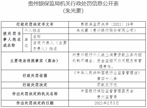 贵州银行违法遭罚 个人线上消费贷款内控机制不健全