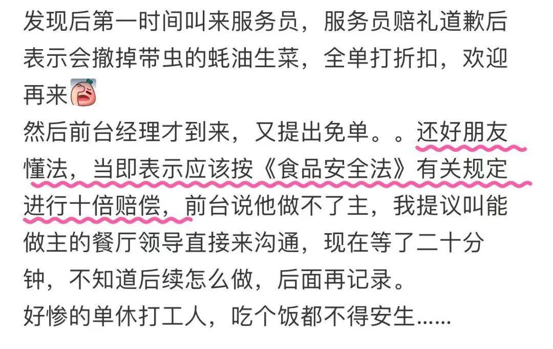 该网友拒绝了经理的免单,要求按“食品安全法”有关规定,进行十倍赔偿。