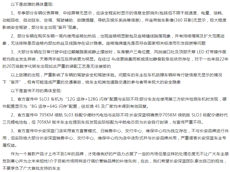 文中谭先生写道:“作为一个首款产品才上市不到1年的品牌,才凭借良好的产品力占据了一定的市场但是这样的处理态度无不让广大车主感觉到寒心并为之未来担忧!介于目前市场同样进行调价营销品牌的补偿先例,在此,我们希望长安深蓝团队拿出自己的担当,不要享负了广大首批支持的车主。”
