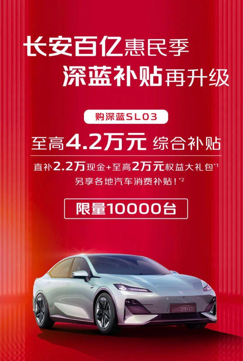 近期,长安汽车启动“百亿惠民购车季”,旗下多款新能源车、燃油车宣布降价,其中长安深蓝SL03至高降价4.2万元。长安深蓝官方小程序显示,凡在3月10日-3月31日下定长安深蓝SL03并提车,下定即享“2.2万元厂家现金补贴+至高2万元八重好礼权益大礼包”,另享各地汽车消费补贴,限量一万台。