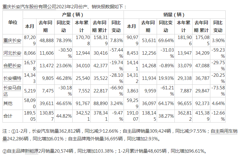 3月8日,长安汽车披露2月份产销数据快报,其中,长安汽车2月份实现产量18.95万辆,同比增长44.82%;实现销量19.1万辆,同比增长38.27%。1-2月,长安汽车实现产量34.25万辆,同比下降9.47%;实现销量36.28万辆,同比下降12.66%。此外,1-2月,长安马自达实现销量7887辆,同比下降73.58%。