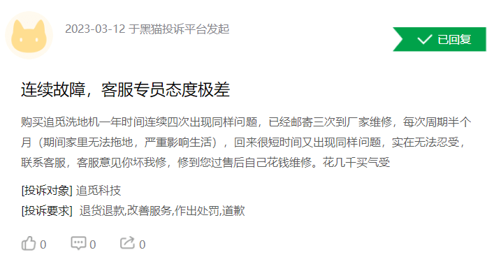 于是,倪叔在黑猫平台快速翻阅了一下近30天的这26个投诉,发现追觅的情况和别的企业不太一样。一般的品牌投诉的问题五花八门,而追觅用户反映的问题非常集中,几乎都是产品质量问题且售后处理不力,有些甚至多次返修也解决不了,和山东商报报道的情况相吻合。