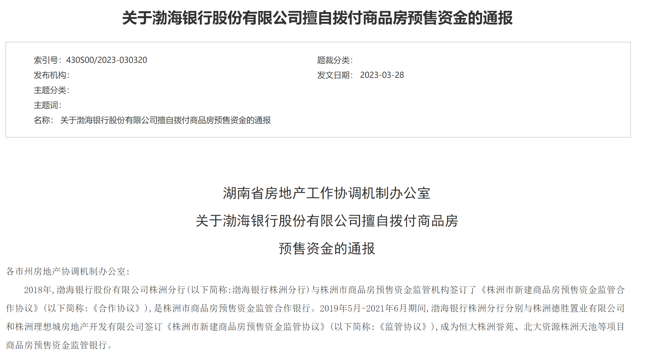 3月29日,湖南省住建厅发布《关于渤海银行股份有限公司擅自拨付商品房预售资金的通报》,表示“从即日起,请各市州(县、市、区)商品房预售资金监管机构暂停与渤海银行股份有限公司及其所辖基层经营单位的商品房预售资金监管合作”。