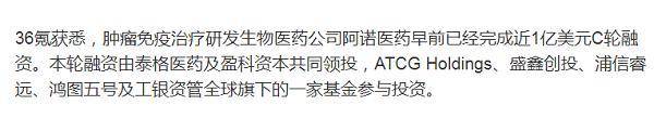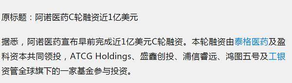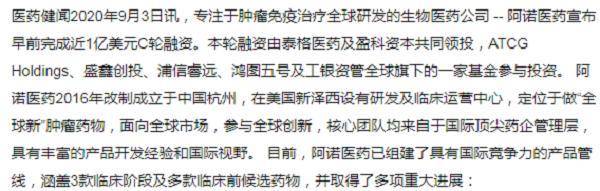 公开报道显示,2020年9月,阿诺生物宣布完成近1亿美元C轮融资,由泰格医药及盈科资本共同领投,ATCGHoldings、盛鑫创投、浦信睿远、鸿图五号及工银资管全球旗下的一家基金参与投资。
