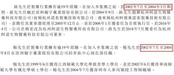 同样关于其高级副总裁杨东辉显示的简历披露也显示,“杨先生于制药行业拥有逾19年经验,在加入本集团前,杨先生于2002年7月至2004年8月在深圳瀚宇药业股份有限公司的多肽中心纯化部任职”。