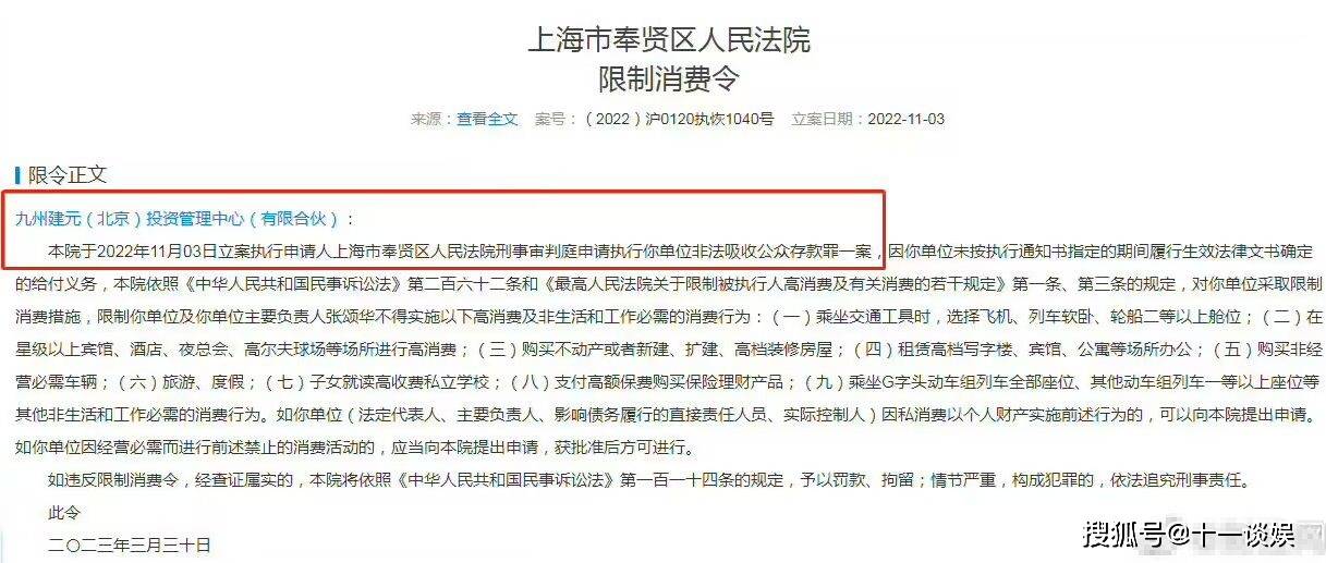据某平台上显示,北京九州建元投资管理中心负责人张颂华增加了一条限制消费令,涉嫌非法吸收公众存款罪被法院起诉,一同被限制消费的还有另外一家公司,这两家企业去年11月被执行8500万。