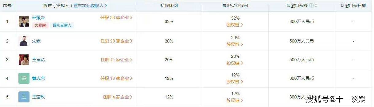 值得一提的是,九州建元公司最大的两位股东分别是演员任泉和王京花。能够看到,该公司的第一大股东就是任泉,持股比例为32%,其次是宋歌和王京花,两人各自持股20%。