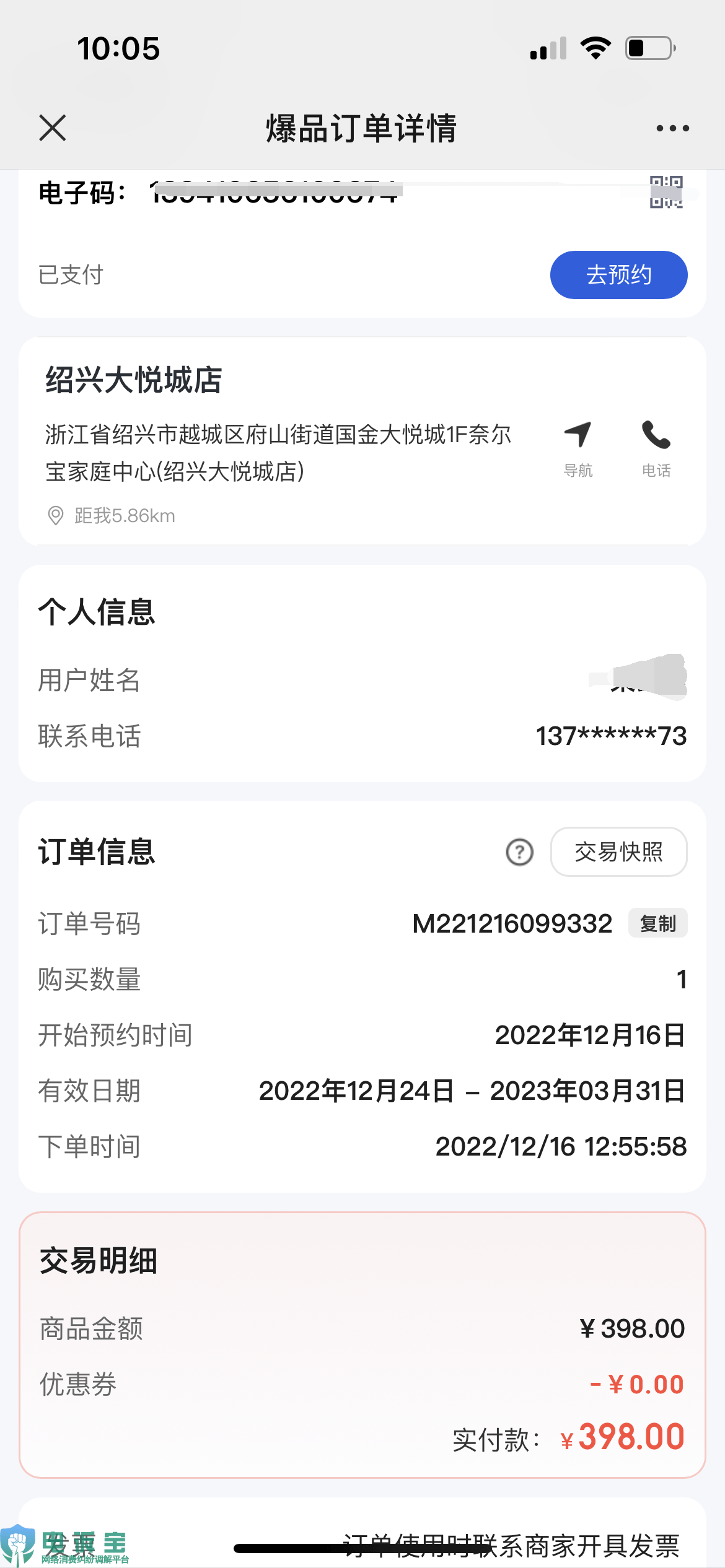 4月5日,浙江省的梁女士向“电诉宝”投诉称其于2022年12月26日在联联周边游绍兴站购买奈尔宝(2大1小)绍兴喜越两次卡,金额398元,出现退款被收取30%服务费的问题,侵害了消费者权益。