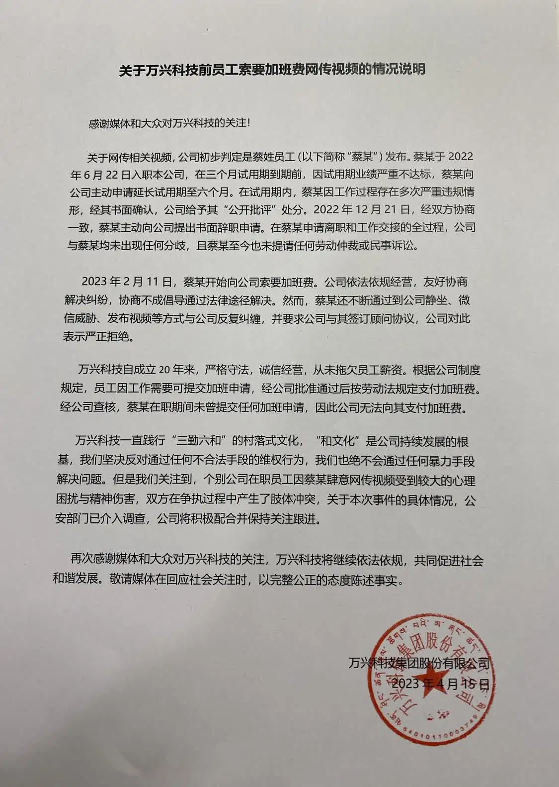 万兴科技还表示,2023年2月11日,蔡某开始向公司索要加班费。公司依法依规经营,友好协商解决纠纷,协商不成倡导通过法律途径解决。然而,蔡某还不断通过到公司静坐、微信威胁、发布视频等方式与公司反复纠缠,并要求公司与其签订顾问协议,公司对此表示严正拒绝。