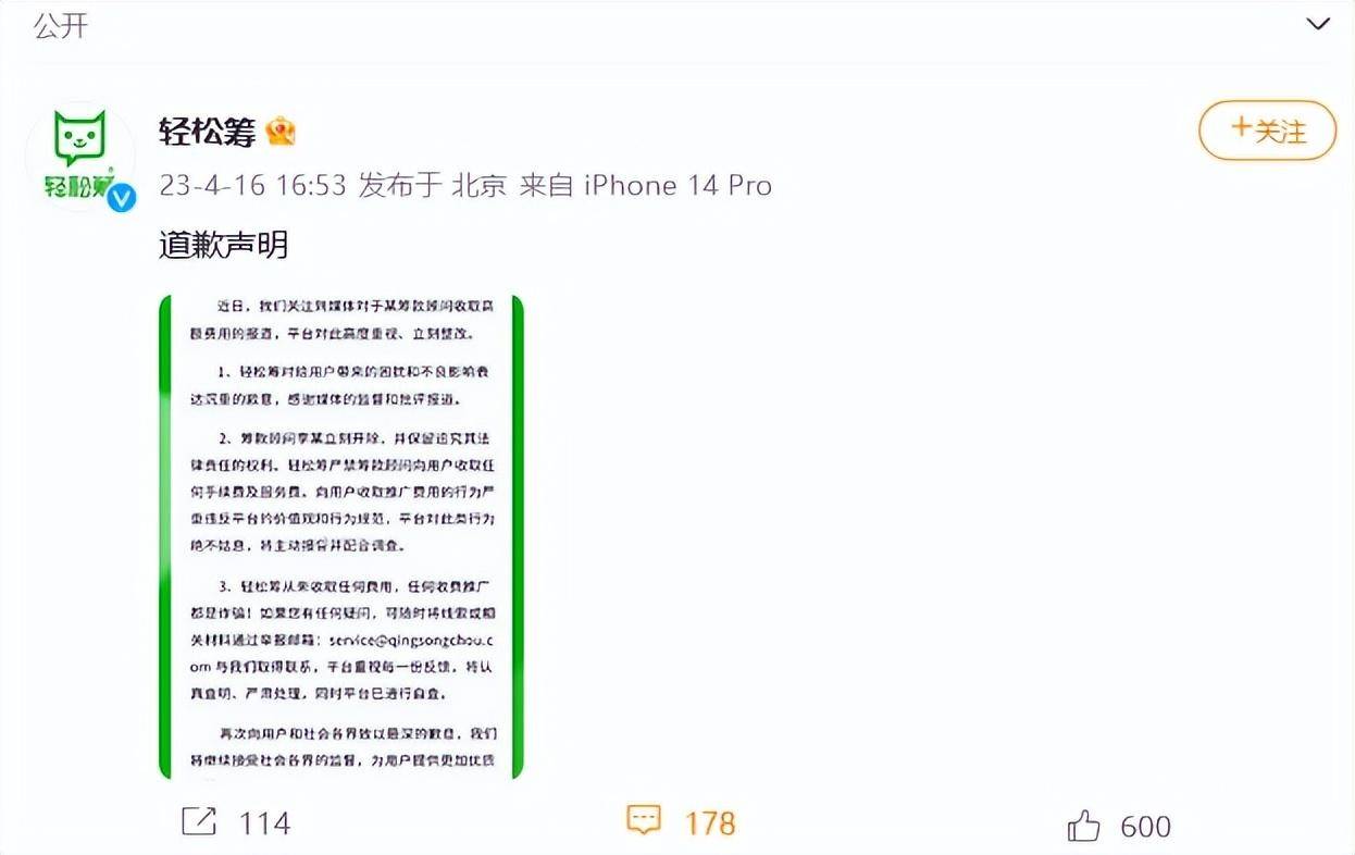 4月16日晚,“轻松筹”官博发声明回应此事:立刻将筹款顾问李某开除,并保留追究其法律责任的权利。轻松筹严禁筹款顾问向用户收取任何手续费及服务费。
