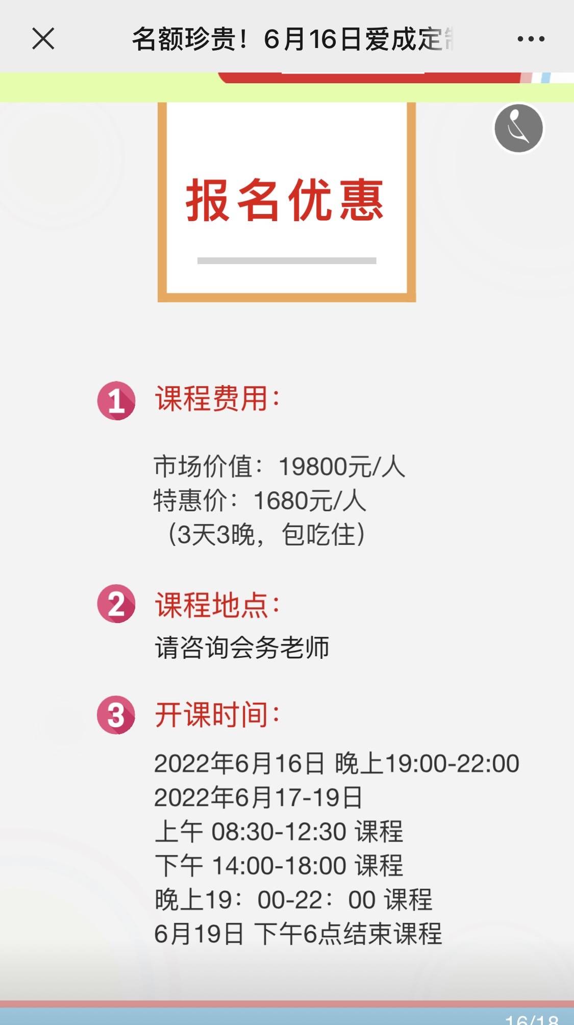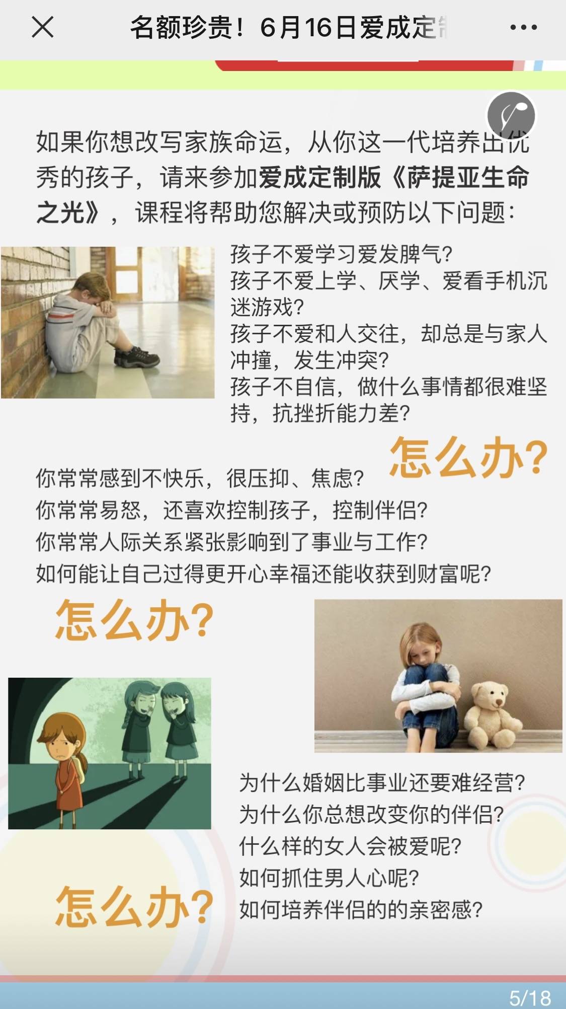 6月9日下午,钟先生发了一个进行心理疗愈的特训营给袁女士,表示这是“为了真正帮助孩子帮助家庭解决问题,家长必须参加的课程”。据该特训营介绍,“如果你想改写家族命运,从你这一代培养出优秀的孩子,请来参加爱成定制版《萨提亚生命之光》。”而若参加,家长每人还需缴纳1680元。钟先生表示这已经是特惠价,如果家长去培训,可以吃三天、住三天,还有课程提供。