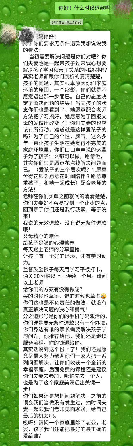 但钟先生的态度却从“去处理”变成“不能退款”,他发了数百字的长信息给袁女士,语气中不乏“教训”甚至指责,“你们口口声声说的这辈子为了孩子什么都可以做,愿意做,其实你们只是愿意花点钱解决问题而已。”