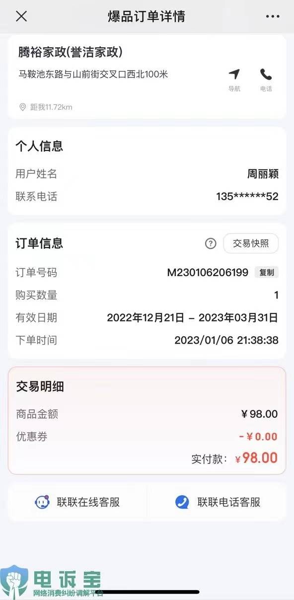 5月4日,浙江省的周女士向“电诉宝”投诉称,她于2023年1月6日在联联周边游温州站购买了一个家政服务套餐,在没有使用的情况下,她申请向联联周边游客服申请退款,却被告知退款要收取30%的手续费。