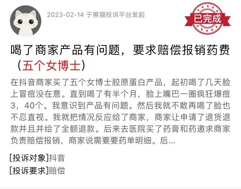 九派财经记者注意到,有消费者在黑猫平台投诉称,其在抖音平台购买了五个女博士产品,“喝了半个月,全脸疯狂爆痘3、40个。皮肤科医生说,胶原蛋白肽含有大量的蛋白质,摄入体内后,可能会刺激皮脂腺分泌大量皮脂、导致爆痘”。最后,该消费者获得全额退款,并被报销了几百元医药费。