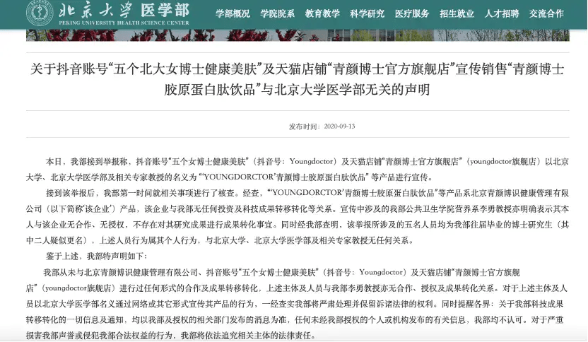 商家第二招靠“虚假营销”,钻监管漏洞。首先,这五个女博士真实身份存疑。北大医学部早在2020年就发布声明,表示与“五个女博士”无关系、无合作、无授权,也不支持该产品。其次,“五个女博士”产品大肆宣传的成分可能只是智商税。专家指出,目前没有证据表明胶原蛋白肽和部分抗糖物质具有美容功效。而打着“北大”噱头的“五大女博士”商家正是瞄准信息差,或无中生有式宣传,或玩起“文字游戏”,用“亢唐”、“亢餹”字眼代替“抗糖”,规避审查风险。