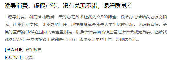 在黑猫投诉上,类似李蓉、刘娜经历的投诉众多,不少表示受到高顿教育的“虚假宣传”“诱导消费”,在报名后,对方没有“兑现承诺”,且退费存在“霸王条款”。截止到5月9日,相关投诉达到1800多条。
