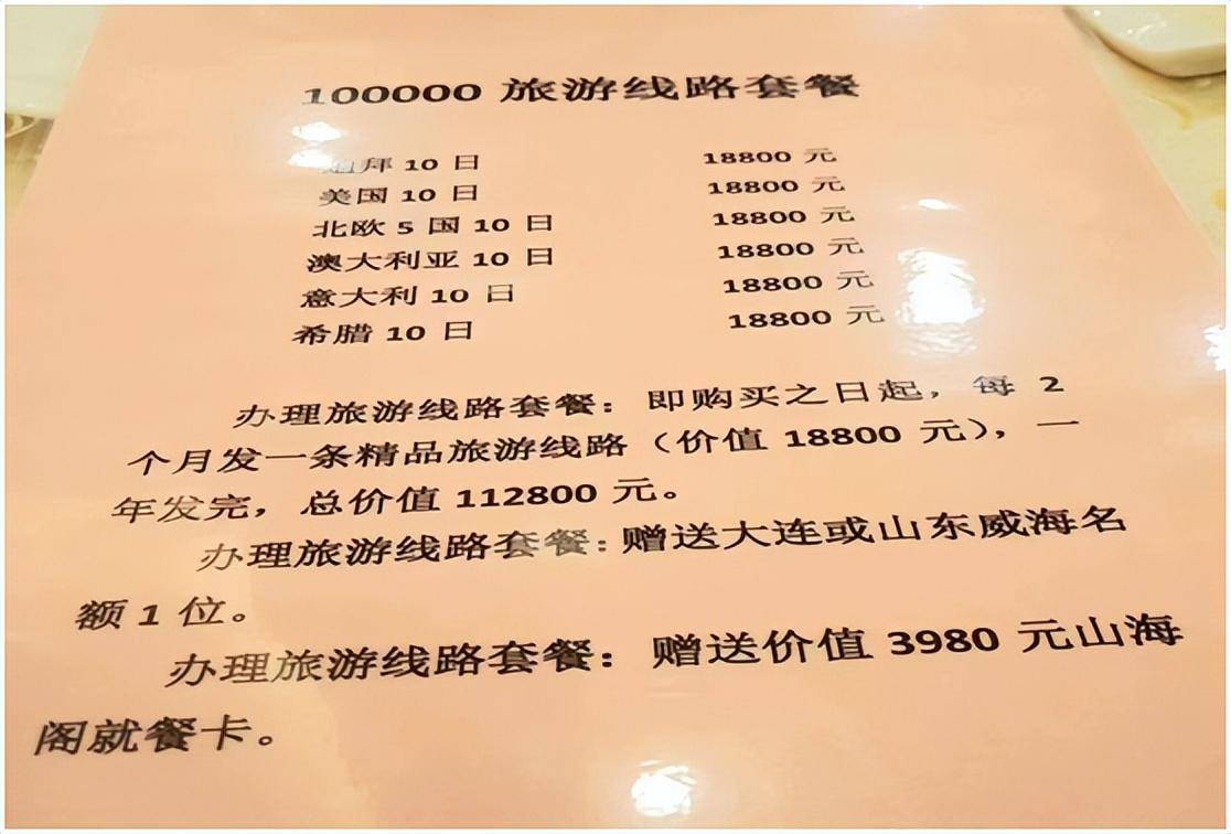 旅游套餐章程:“1、办理旅游线路套餐:即购买之日起,每2个月发一条精品线路(价值18800元),一年发完,总价112800元;2、办理旅游线路套餐:赠送大连或山东威海名额1位;3、办理旅游线路套餐:赠送价值3980元山海阁就餐卡;4、合同期为一年,客户签订不足一年申请中途退款的视为违约,不享受任何福利及待遇,已经享受待遇需按价扣除,并需支付套餐金额的10%作为违约金,剩余余款返还。”
