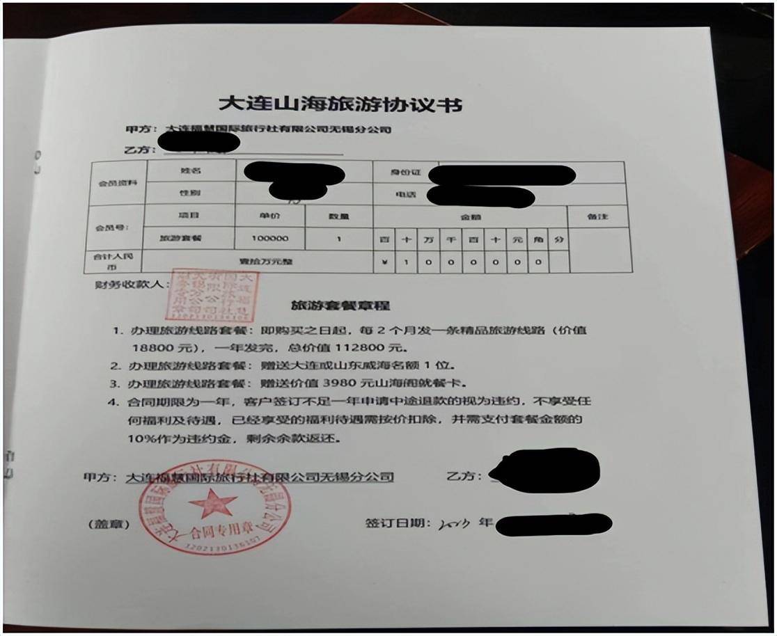 知情人拿出一份10万元投资的《大连山海旅游协议书》和10几张投资人交纳费用的发票给记者看。《大连山海旅游协议书》内容非常简单,甲方为大连福慧国际旅行社有限公司无锡分公司,乙方为投资人,再下面就是表格,内容是:会员资料(包括姓名、性别、身份证号、电话);会员号(包括项目、单价、数量、金额);合计人民币;财务收款人:大连福慧国际旅行社有限公司无锡分公司财务专用章。再下面就是“旅游套餐章程”。
