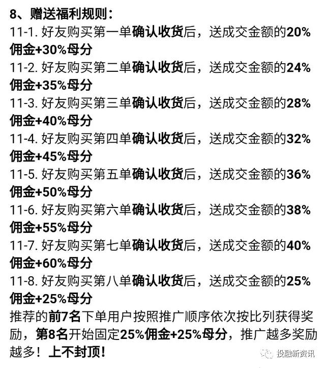 推荐的前7名下单用户按照推广顺序依次按比列获得奖励,第8名开始固定25%佣金+25%母分,推广越多奖励越多!上不封顶!