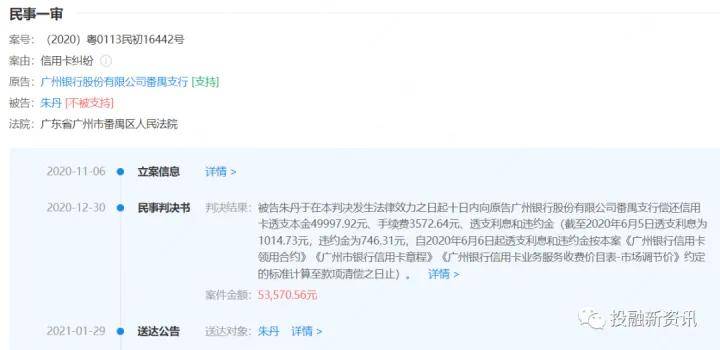 据企查查公布的民事判决书显示,朱丹于2018年3月向广州银行申领了一张信用卡,在使用该卡过程中发生透支钱款并逾期严重,截止至2020年6月5日,尚欠广州银行本金49997.92元,手续费3572.64元,利息1014.73元,违约金暂计746.31元,共计人民币55331.6元。经广州银行多次催告,朱丹至今仍未清偿。
