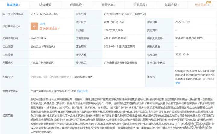 据企查查显示,广州七亩地科技合伙企业(有限合伙)成立于2022年9月19日,位于广州市黄埔区开创大道2395号1101-1室,注册资本1200万,实缴不详,法人代表朱丹持股44.375%,为最大股东,李爱书持股29.5%。