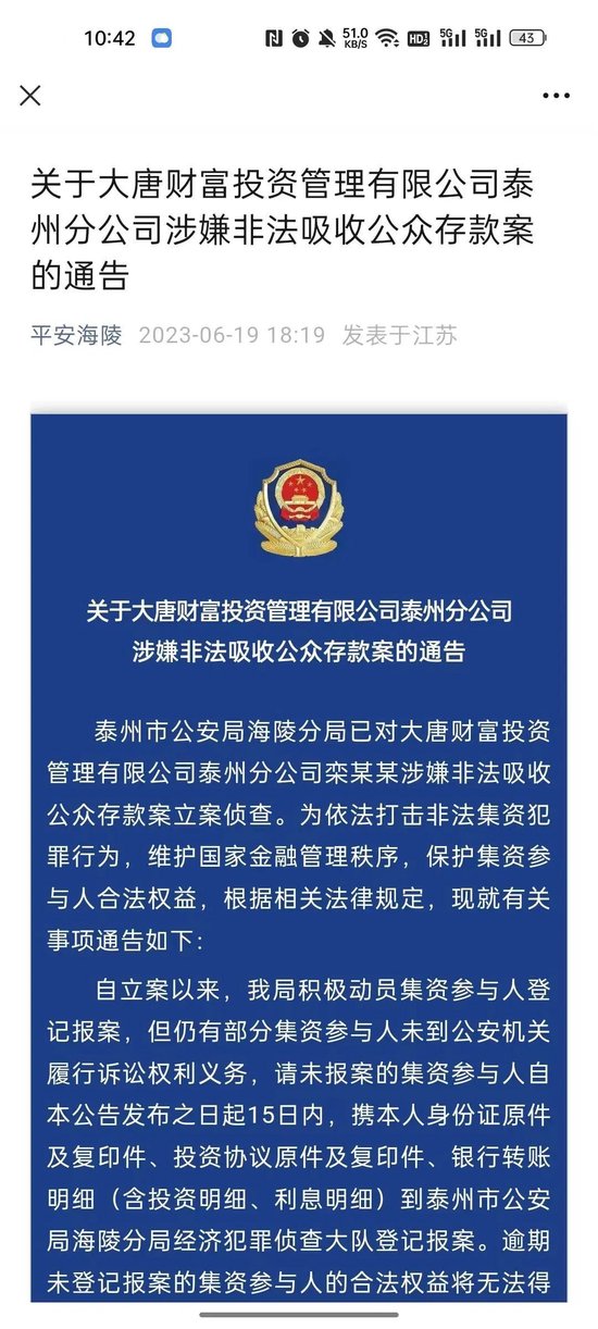 6月19日晚,泰州市公安局海陵分局在微信公众号“平安海陵”发布了《关于大唐财富投资管理有限公司泰州分公司涉嫌非法吸收公众存款案的通告》。通告称,该局已对大唐财富投资管理有限公司泰州分公司栾某某涉嫌非法吸收公众存款案立案侦查。