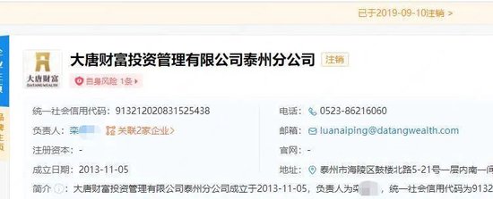 据悉,通告中“栾某某”,为大唐财富泰州分公司法人栾X平,企查查信息显示,该公司已于2019年9月10日注销。