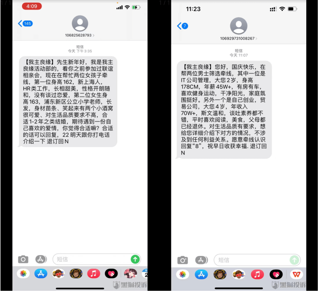 另有两位网友在黑猫平台发帖反映,不知道我主良缘从哪里获取本人信息,一直发短打电话骚扰,影响了我的生活,请停止对我的短信骚扰。以下为两个网友贴出的短信截图。(注:开甲财经注意到,有网友在微博上也发过我主良缘类似的骚扰短信)