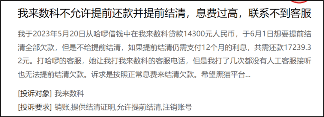某借款人在黑猫投诉称,他2023年5月20日从哈啰借钱中的我来数科贷款14300元,6月1日,他想提前结清全部欠款,但我来贷客服称,如果提前结清仍需支付12个月的利息,共需还款17239.32元。借款人拨打哈啰借钱的客服,后者将皮球踢给我来数科,打了几次电话要求提前结清,仍然遭到我来数科的拒绝。