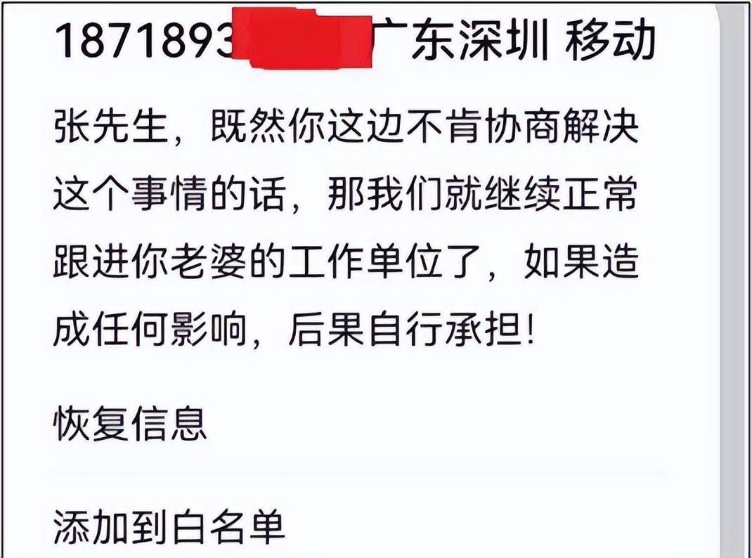 不仅如此,催收人员还发短信给这名借款人,威胁称,“既然你不肯协商解决这个事情的话,我们就继续正常跟进你老婆的工作单位,如果造成任何影响,后果自行承担。”