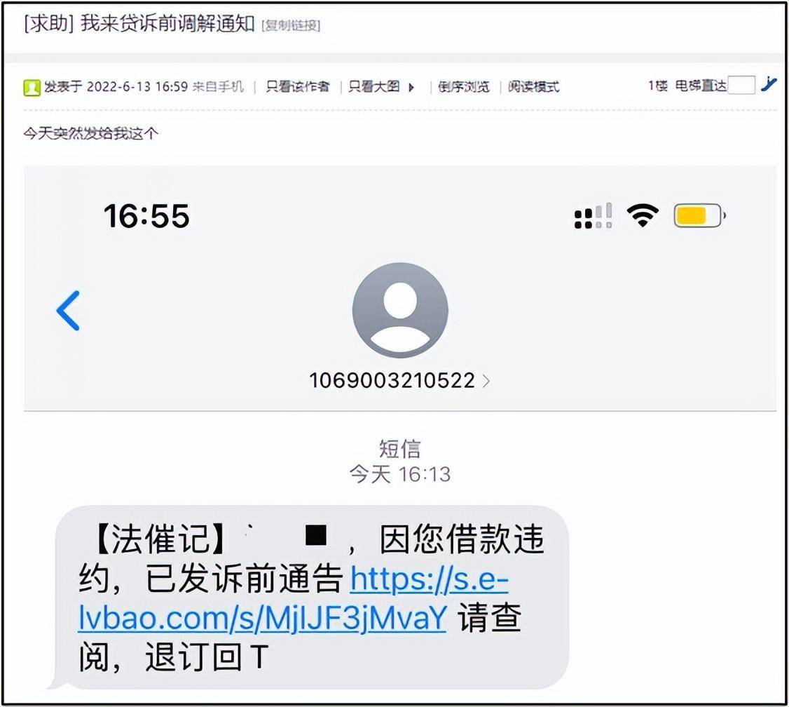 6月13日,有借款人在某社区论坛贴出一份我来贷催收人员发给他的一条短信,短信里有一个所谓的“诉前通告”链接,点击后能看到一份“诉前调解告知”。告知书称:“通知×××,证件号×××;我来贷信用贷逾期追偿纠纷一案,经委托人多次催缴告知,至今仍拒不偿还,经初步怀疑你”贷款诈骗“、”扰乱金融秩序“、”虚假信息“等情况属实,符合民事诉讼规定。且以私自占有国有信贷资产企图明显,且金额较大,将依据《民事诉讼法》提起诉讼。