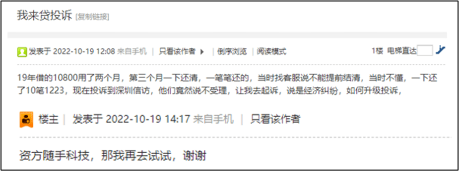 有一名借款人称,2019年时他在我来贷借了10800元,分12期还款,每期还款1223元,资金方为P2P平台随手记,两个月后,他想提前一次性还清,但客服说不能提前结清。该借款人没办法,只好一下子存入10笔1223元。用IRR公司测算可知,我来贷与随手记合作放贷的年化利率高达60.78%,难怪我来贷拒绝借款人提前还款。