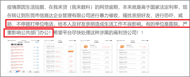 2022年10月,一名借款人在黑猫投诉称,他在我来贷(我来数科)的网贷逾期后,被转让到东莞市信晟达企业管理有限公司进行催收,后者骚扰其亲朋好友,不停拨打单位电话,给本人及好友亲朋造成生活工作不良影响。有的单位是医院,严重影响公共部门办公!