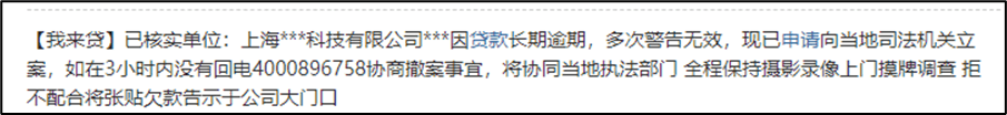 需要指出的是,这并不是孤立个案。在另一条我来贷发给借款人的催收短信中,同样出现了假冒司法机关的现象。我来贷发送的该短信称,“×××因贷款长期预期,多次警告无效,现已申请向当地司法机关立案,如在3小时内没有回电协商撤案事宜,将协同当地执法部门,全程保持摄影录像上门摸牌调查,拒不配合将张贴欠款告示于公司大门口。”
