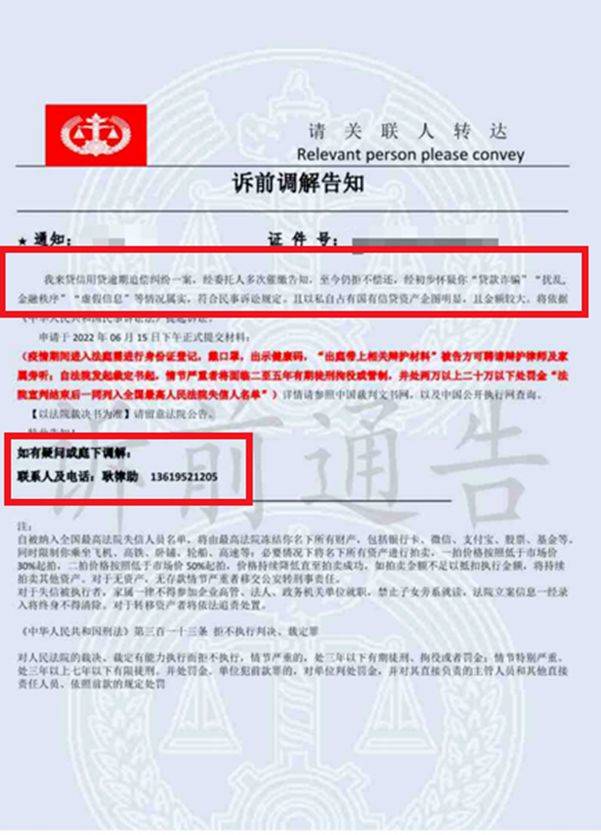 有消费者在网上投诉称,其收到我来贷催收人员发给他的一条“诉前通告”的短信链接,点击后能看到一份“诉前调解告知”,该调解文件背景图案是一个象征司法公正的天平,显然是一份模仿司法文书的山寨货。