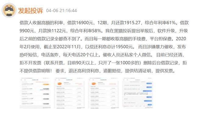 今年4月6日,一位消费者投诉称,其在我来数科借款16900元,12期月还款1915.27元,综合年利率61%。借款9900元,月款还1122元,综合年利率58%,每一期都收取高额的手续费、平台担保费。
