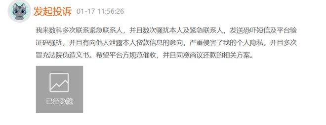 今年以来,已有不少借款人在网络投诉平台上曝出我来贷冒充司法机关催收的情况。比如1月17日,有消费者投诉称“我来数科多次联系紧急联系人,发送恐吓短信及平台验证码骚扰,并且有向他人泄露本人贷款信息的意向,严重侵害了个人隐私,并且多次冒充法院伪造文书。”