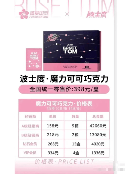 公众号官网注销,生产厂家环境脏乱等一系列证据表明魔力可可背后并不简单。有多家媒体曾曝光魔力可可的内部传销手法,以销售减肥产品为名义,拉动其他人参与传销,代理层级高达五级,分别为零售价,VIP会员,钻石会员,B级经销商,A级经销商。