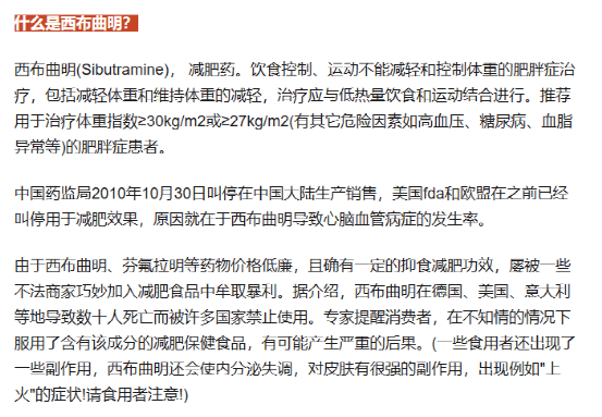 就在不久前,有一位2岁的女孩因为误食了几粒“减肥巧克力”后突然去世,由儿童医院给出的死亡诊断是:西布曲明中毒,心肌损害,呼吸,心力衰竭。悲剧不断上演,但生产减肥产品的商家并未因此悔过,反而是为了售卖减肥产品,夸大宣传,违背科学根据,发布虚假广告。